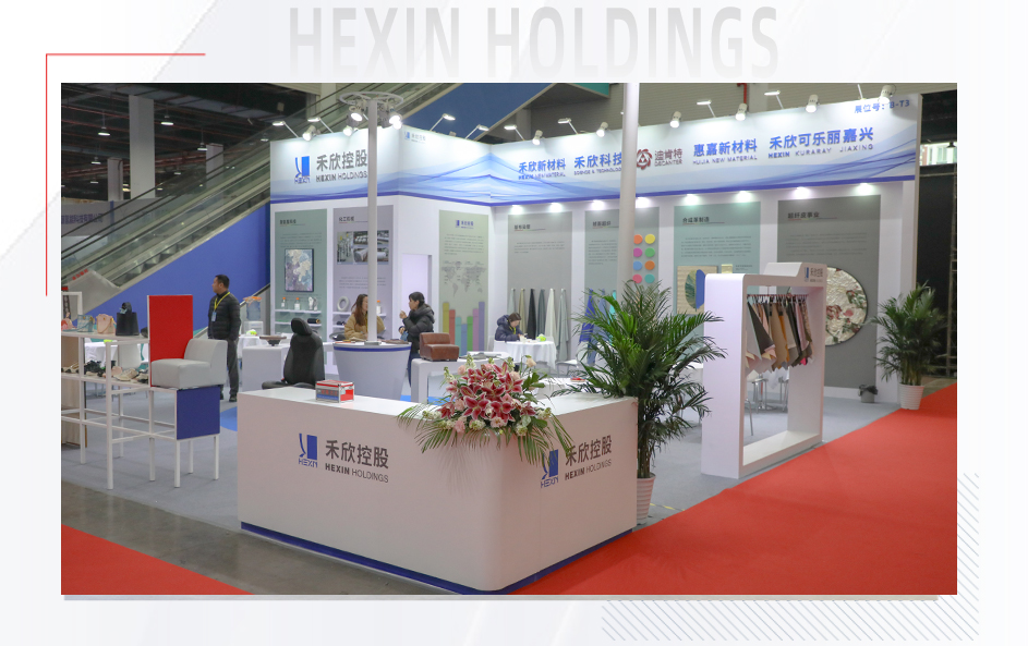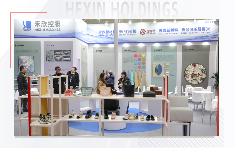 禾欣展臺B-T3位于會展中心中軸線,占據(jù)了展會C位。展臺以開放式布局體現(xiàn)開放、包容的展陳理念;藍、白主調(diào)輔以淺綠、淺灰、淺咖等淺色系,傳達出簡約、舒適的視覺效果。展板清晰展示了聚氨酯科技、化工機械、基布染整、絨面超纖、合成革、超纖皮等主營業(yè)務(wù),令參觀者一目了然。三幅皮革畫作既傳達了綠色環(huán)保理念,也為展會增添藝術(shù)氣息。展品除了豐富的皮革掛樣外,成品展示區(qū)還陳列了汽車內(nèi)飾、沙發(fā)、箱包、鞋靴、運動、電子包裝等的應(yīng)用場景。