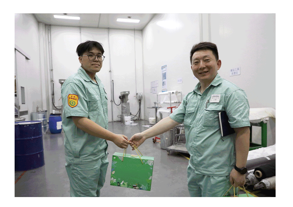 周二下午兩點,走進新材料車間,一股熱浪撲面而來。車間員工正緊鑼密鼓地忙活手頭的工作:輥涂、干燥、質(zhì)檢、收卷、搬運……經(jīng)營層領(lǐng)導(dǎo)、生產(chǎn)管理人員為一線員工送上牙膏、毛巾、沐浴露、香皂、藿香正氣水等消暑物資,并道上一聲:“您辛苦了!”慰問現(xiàn)場,領(lǐng)導(dǎo)及管理人員還反復(fù)叮囑班組長們,要合理安排一線員工的工作和休息時間,做好防暑降溫工作,在不影響“保訂單、保交付”的同時,確保高溫期間人員、設(shè)備的安全。此外,超纖板塊領(lǐng)導(dǎo)為禾欣可樂麗嘉興、海鹽,斯威德三家公司及車用革的一線生產(chǎn)人員送上慰問,對他們在高溫天氣恪守崗位表達感謝;科技板塊領(lǐng)導(dǎo)對科技、物流、惠嘉等多家公司一線員工進行現(xiàn)場慰問,叮囑大家安全生產(chǎn)、合理作息。
